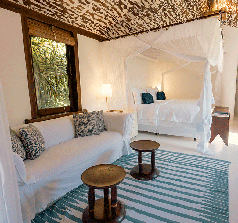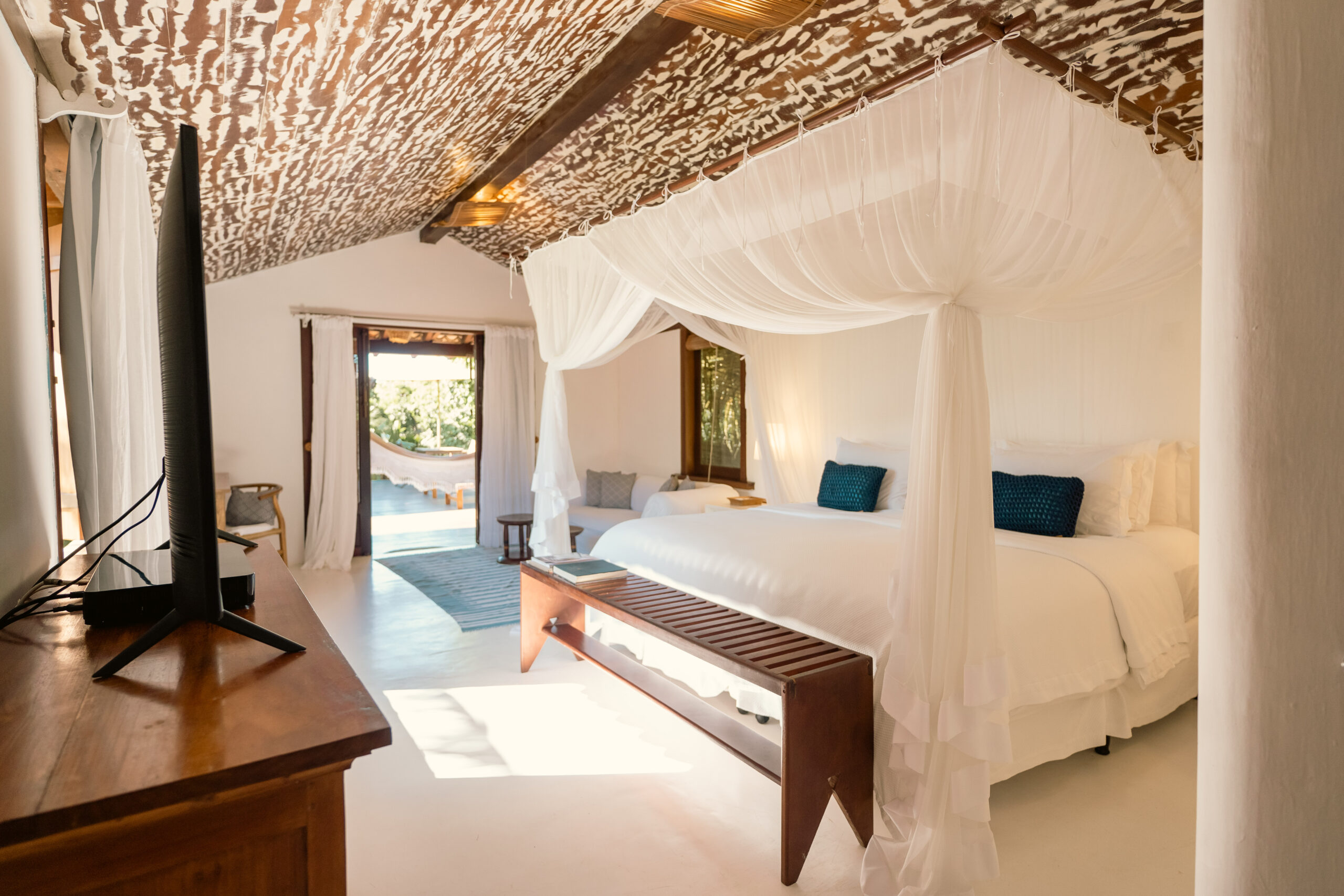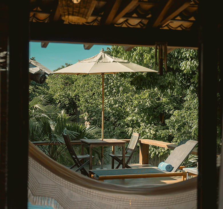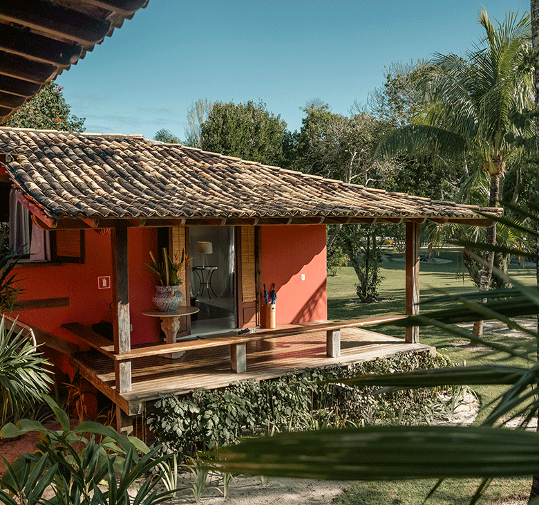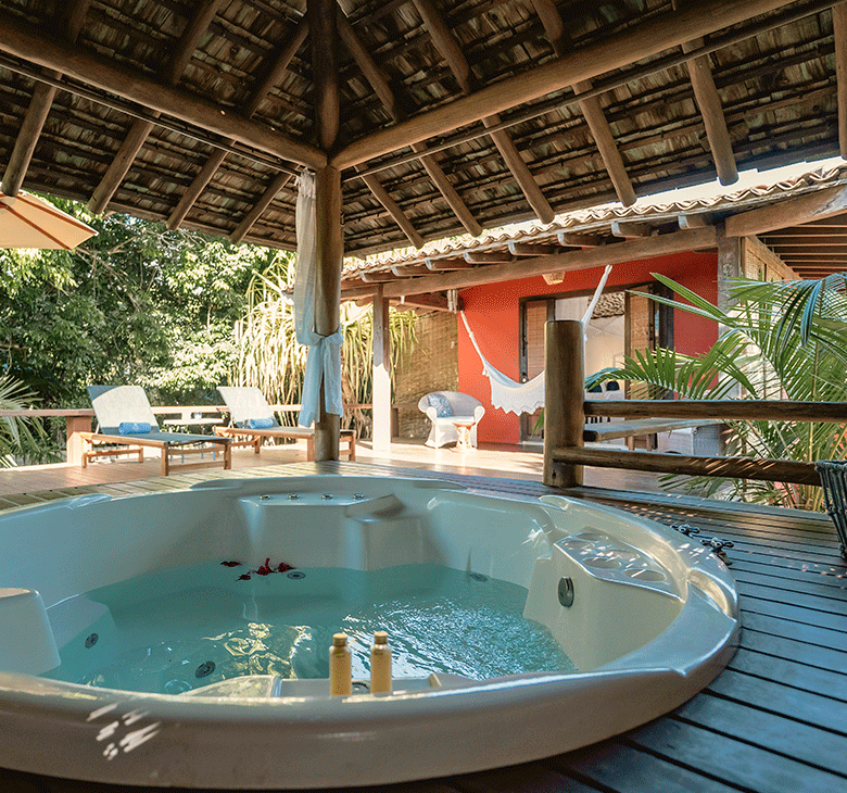 O Bangalô Trancoso tem 140m² garantindo extrema privacidade. Com vista para o jardim, a acomodação possui um deck de madeira com jacuzzi, espreguiçadeiras e rede, e em outro ambiente uma sala social, criando um espaço amigável e ideal para receber amigos ou compartilhar momentos em família.
